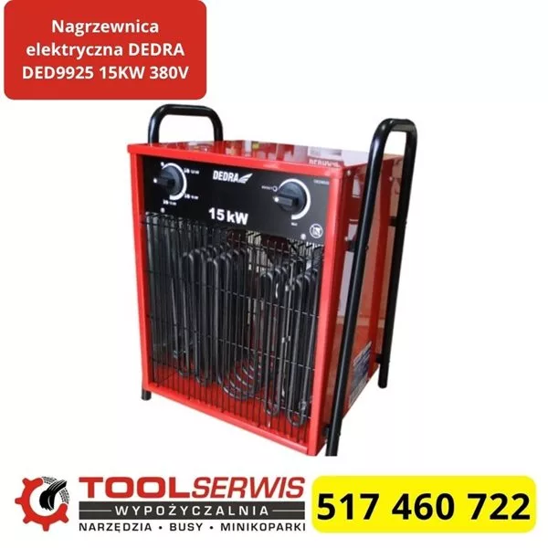 Nagrzewnica elektryczna DEDRA DED9925 to trójfazowa nagrzewnica do szybkiego, czystego ogrzewania bez spalin. Trzy stopnie mocy 5-10-15 kW pozwalają dopasować wydajność do warunków. Wbudowany termostat utrzymuje stałą temperaturę i ogranicza zużycie energii. Wentylator o przepływie ok. 1290 m3/h równomiernie rozprowadza ciepło. To solidny wybór do hal, warsztatów i remontów.